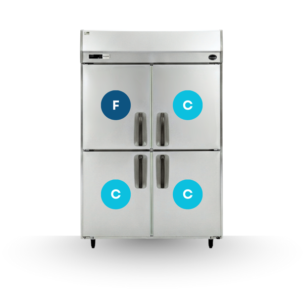 1200(W) x 800(D) x 1950(H) mm F: -25°C ~ -15°C / C: -6°C ~ +12°C